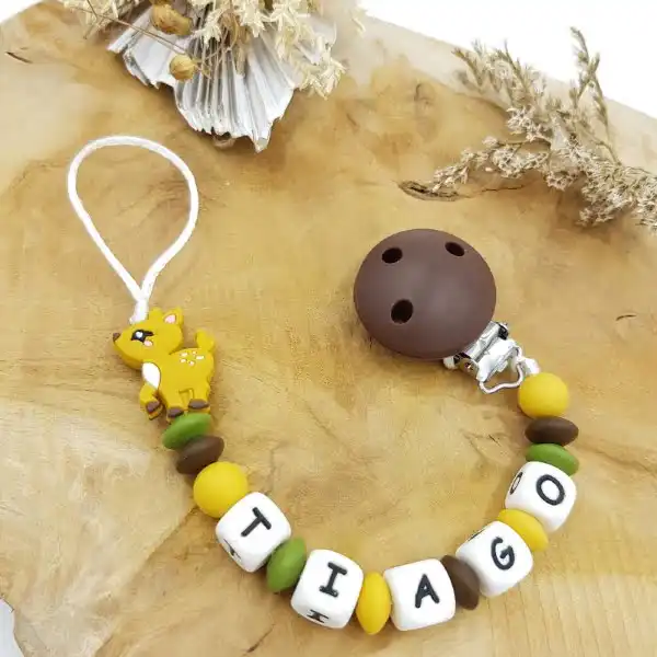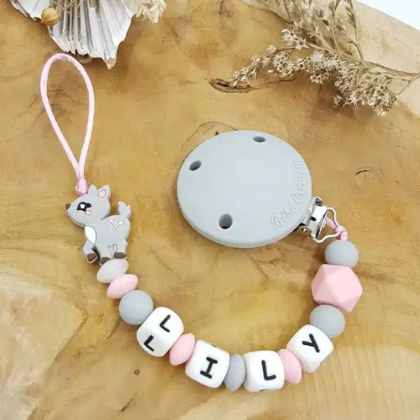 Offrez à votre bébé une attache tétine personnalisée en silicone avec motif biche. Pratique et sécurisée, elle évite la perte de la sucette. Personnalisez-la avec le prénom de votre enfant pour une touche unique. Facile à nettoyer et résistante aux mordillements. Commandez maintenant !