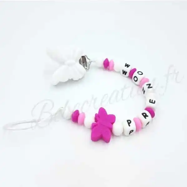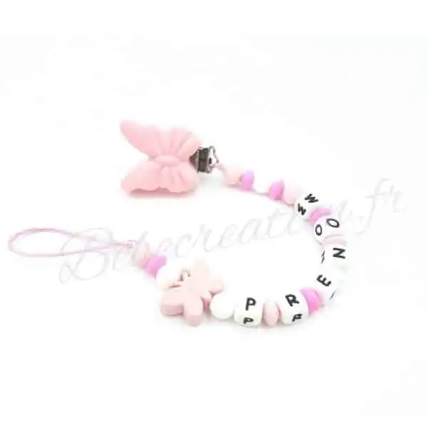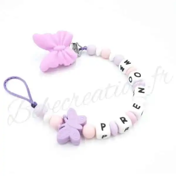 Offrez à votre bébé une attache tétine personnalisée en silicone avec motif papillon. Pratique et sécurisée, elle évite la perte de la sucette. Personnalisez-la avec le prénom de votre enfant pour une touche unique. Facile à nettoyer et résistante aux mordillements. Commandez maintenant !