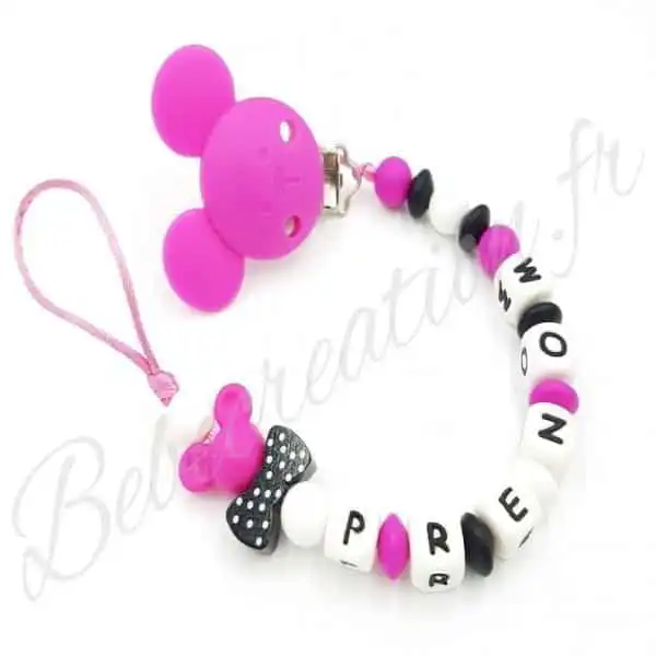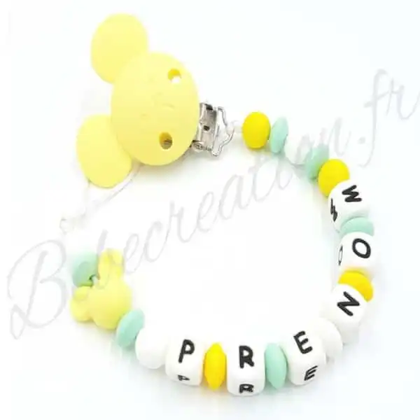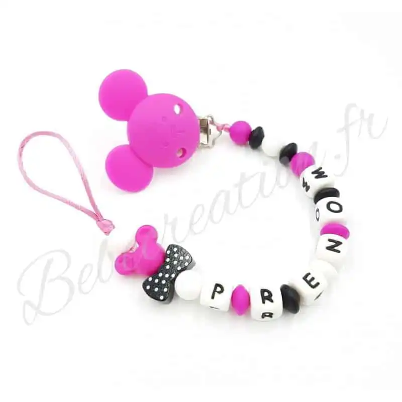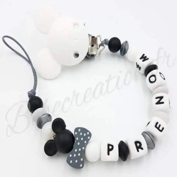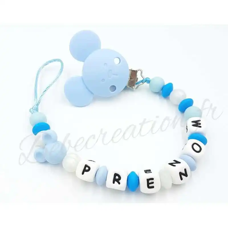 Offrez à votre bébé une attache tétine personnalisée en silicone avec motif Souris. Pratique et sécurisée, elle évite la perte de la sucette. Personnalisez-la avec le prénom de votre enfant pour une touche unique. Facile à nettoyer et résistante aux mordillements. Commandez maintenant !